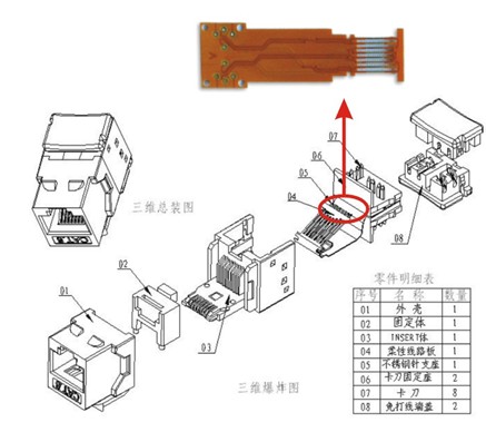 普通的網(wǎng)絡(luò)信息模塊,采用的是硬式線路板+鍍金銅針,雙邊直列式IDC的方式。而此新設(shè)計的基于柔性線路板的網(wǎng)絡(luò)信息模塊,采用柔性線路板代替硬板;與軟板一體化的金手指代替鍍金銅針,與RJ45水晶頭接觸的可靠性由不銹鋼針支座保證;打線部分采用上下分列式IDC代替雙邊直列式IDC.此結(jié)構(gòu)將硬板+鍍銅金針原來分列需焊錫的分離式結(jié)構(gòu)改成一體式柔板金手指結(jié)構(gòu),優(yōu)化了信號的插入損耗及回波損耗;進線采用上下分離式IDC,相對雙邊直列式IDC,大大優(yōu)化了信號串音。此外,本模塊采用完全免工具的打線端蓋,對于工程施工來講,提升了布線效率。