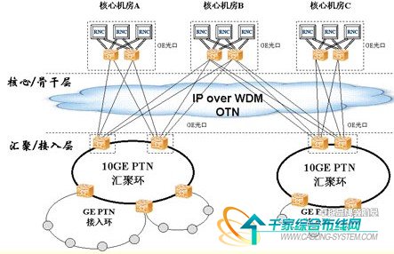 盡管獨立組網(wǎng)模式中核心骨干層組建的PTN10吉比特以太網(wǎng)環(huán)路業(yè)務(wù)也可以通過波分平臺承載,但波分平臺只作為鏈路的承載手段,而聯(lián)合組網(wǎng)模式中,IPoverWDM/OTN不僅僅是一種承載手段,而且通過IP over WDM/OTN對骨干節(jié)點上聯(lián)的GE業(yè)務(wù)與所屬交叉落地設(shè)備之間進行調(diào)度,其上聯(lián)GE通道的數(shù)量可以根據(jù)該PTN中實際接入的業(yè)務(wù)總數(shù)按需配置,節(jié)省了網(wǎng)絡(luò)投資。同時,由于骨干層PTN設(shè)備僅與所屬RNC機房相聯(lián),因此,聯(lián)合組網(wǎng)模式非常適于有多個RNC機房的大型城域網(wǎng),極大地簡化了骨干節(jié)點與核心節(jié)點之間的網(wǎng)絡(luò)組建,從而避免了在PTN獨立組網(wǎng)模式中,因某節(jié)點業(yè)務(wù)容量升級而引起的環(huán)路上所有節(jié)點設(shè)備必須升級的情況,節(jié)省了網(wǎng)絡(luò)投資。