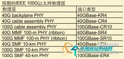 負責制定40G和100G以太網(wǎng)(100GbE)技術(shù)規(guī)范的IEEE 802.3ba任務(wù)組目前關(guān)注銅纜、單?;蚨嗄9饫w上的多通道(4或10通道)傳輸,傳輸距離從100m到40km,標準中還包括了背板技術(shù)規(guī)范(見表)。根據(jù)不同的光PMD(物理介質(zhì)相關(guān)層),可以選用并行光器件或CWDM。