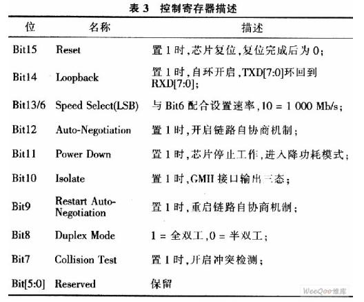 88E1111共有32個控制寄存器,每個寄存器16 bit,地址偏移量為OOH~1FH。功能為復(fù)位芯片、設(shè)置速率、雙工模式等,其描述如表3所示。