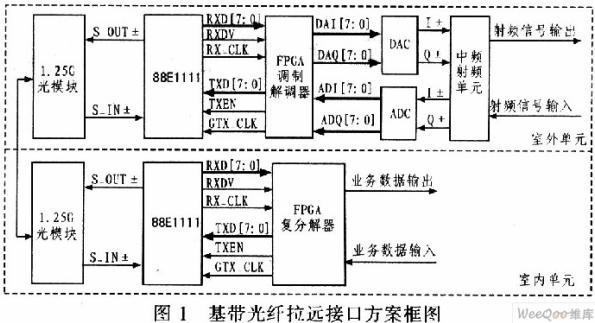 根據(jù)88E1111的功能特點和基帶光纖拉遠的設(shè)計要求,本文提出了用88E1111完成數(shù)字微波接力系統(tǒng)基帶光纖拉遠的接口設(shè)計方案。接口設(shè)計方案框圖如圖1所示,主要由室內(nèi)單元、室外單元2部分組成。發(fā)方向,室內(nèi)單元業(yè)務(wù)碼流輸入FPGA復(fù)分解器,完成業(yè)務(wù)數(shù)據(jù)打包,封裝成符合IEEE802.3標準的數(shù)據(jù)幀結(jié)構(gòu),通過GMII接口發(fā)送到88E1111,由88E1111完成數(shù)據(jù)并串轉(zhuǎn)換,通過高速串行信號接口將信號發(fā)送到1.25 G光收發(fā)器,完成電光轉(zhuǎn)換后向室外單元發(fā)送1.25 G光信號。室外單元1.25 G光收發(fā)器接收光信號,完成光電轉(zhuǎn)換,通過高速串行信號接口將高速電信號輸入88E1111,由88Ellll完成數(shù)據(jù)串并轉(zhuǎn)換,通過GMII接口將并行數(shù)據(jù)發(fā)送到FPGA調(diào)制解調(diào)器,完成數(shù)據(jù)解幀、調(diào)制后,通過中頻射頻單元向空中發(fā)送無線射頻信號。收方向為發(fā)方向的逆向流程。