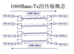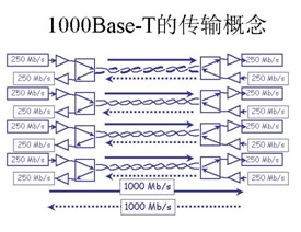 1000Base-T就是超五類系統(tǒng)傳輸千兆網(wǎng)絡(luò)所采用的標(biāo)準(zhǔn)。1000Base-T標(biāo)準(zhǔn)可支持在符合ANSI/TIA/EIA-568A(1995) 標(biāo)準(zhǔn)的五類雙絞線上運(yùn)行千兆以太網(wǎng)。1000Base-T采用4對五類雙絞線完成1000Mbps的數(shù)據(jù)傳送,每一對雙絞線傳送250Mbps的數(shù)據(jù)流。但因?yàn)槲孱惣俺孱愲p絞線的設(shè)計(jì)帶寬僅有100MHz,要實(shí)現(xiàn)雙向傳輸1000Mbps的網(wǎng)絡(luò),必須滿足以下要求: