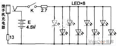 當(dāng)電池電壓為4.38V時(shí)工作電流實(shí)測(cè)約150mA,LED上的壓降為3.2V。為有效延長(zhǎng)電池的使用時(shí)間,筆者決定在按鈕開(kāi)關(guān)K后面串接小阻值的限流電阻,經(jīng)反復(fù)試驗(yàn)采用2.7Ω電阻時(shí)電流降為120mA,亮度亦無(wú)明顯變化。如嫌電池昂貴也可改用220V交流市電,這就需要配一個(gè)合適的電源適配器,建議選用家中已廢棄的手機(jī)電池充電器,由于手機(jī)充電器插頭外形繁多不一,需提前用單聲道耳機(jī)插頭改造一下,筆者找到的充電器輸出電壓6.28V,改造后電路原理圖如圖2所示,實(shí)測(cè)工作電流約138mA。