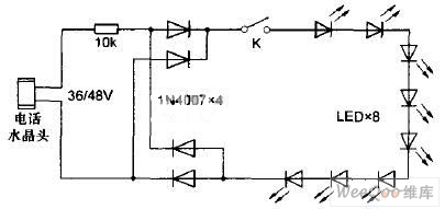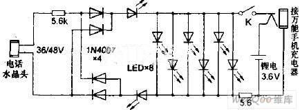 又稱(chēng)免電燈(即網(wǎng)上賣(mài)家俗稱(chēng)的緬甸燈),因?yàn)樗捎闷胀矣霉潭娫?huà)的進(jìn)線(xiàn)電壓做電源,無(wú)需電池或交流市電,把尾部的水晶頭插入電話(huà)分機(jī)接口即可照明,不用另交電費(fèi),也不用擔(dān)心停電。此外還能兼作電話(huà)來(lái)電閃爍燈.提醒聽(tīng)力不太好的老年人及時(shí)接電話(huà),因電話(huà)摘機(jī)后LED燈會(huì)熄滅,還能幫你及時(shí)發(fā)現(xiàn)電話(huà)是否被他人盜打,同時(shí)也具有一定的防雷擊保護(hù)作用。不過(guò)由于該產(chǎn)品使用的是電話(huà)所屬的電信機(jī)房饋電電源,使用時(shí)一旦索取電流過(guò)大難免會(huì)影響電話(huà)撥打和傳真收發(fā),特別是ADSL寬帶用戶(hù)撥號(hào)上網(wǎng)時(shí)容易造成頻繁掉線(xiàn)。圖3是電話(huà)線(xiàn)LED燈電路工作原理圖,36V或48V的電話(huà)線(xiàn)路直流電壓經(jīng)10kΩ限流電阻并由4個(gè)二極管(或整流橋)作極性變換后加在LED上,當(dāng)電話(huà)饋電電壓為36V時(shí),實(shí)測(cè)工作電流約1.2mA,亮度偏低,把限流電阻換成5.6kΩ時(shí)工作電流升為2.1mA:亮度稍微有些增加??紤]到電話(huà)線(xiàn)LED燈對(duì)上網(wǎng)存在不利影響,不能經(jīng)常接在電話(huà)線(xiàn)上,筆者又對(duì)該燈進(jìn)行了一番改造,改造后的電路原理圖如圖4所示,把中間的6顆LED改成并聯(lián),同時(shí)增加一塊3.6V的手機(jī)鋰離子電池,平時(shí)使用內(nèi)置的新增鋰電工作,當(dāng)限流電阻為5.6Ω時(shí),工作電流約120mA,亮度比較令人滿(mǎn)意。緊急情況下仍可采用插入電話(huà)分機(jī)接口照明,改造后的工作電流約4.6mA,亮度還算說(shuō)得過(guò)去。