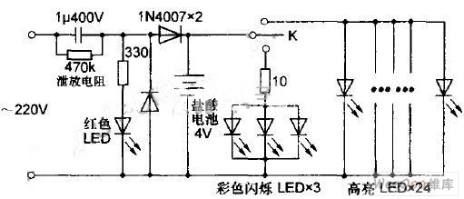 根據(jù)實(shí)物畫(huà)出的電路工作原理圖如圖5所示,220V交流市電經(jīng)電容降壓、二極管整流后給鉛酸蓄電池充電,紅色LED作充電指示。充好電后使用時(shí)閉合按鈕開(kāi)關(guān)K,將首先接通3顆彩色閃爍LED,發(fā)出夢(mèng)幻般變化莫測(cè)的七彩光芒,在夜間平添一些生活樂(lè)趣,再按一下開(kāi)關(guān)K則關(guān)閉彩色閃爍LED,接著再按才會(huì)接通24顆并聯(lián)的高亮LED,由于數(shù)目較多,照明效果很好。