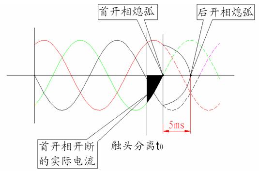 真空斷路器的線性的伏安特性賦予了它可以并聯(lián)存在的特性(對觸頭的燒損甚微),又由于它大部分空間λ>T,因此電流過零成功開斷的必要條件就一定是:在電流過零前電弧一定為擴(kuò)散型。滿足λ>Ti0不等式。有了對真空電弧的初步了解,既然是開斷三相交流電,又是過零開斷。就必定會有首開相和后開相(中性點(diǎn)不接地系統(tǒng)),見圖2。