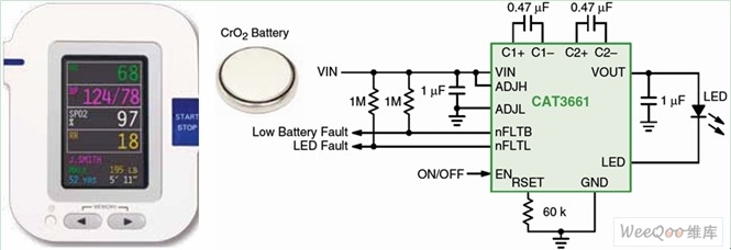 圖4:針對扣式電池優(yōu)化的CAT3661 LED驅(qū)動(dòng)器應(yīng)用電路圖。