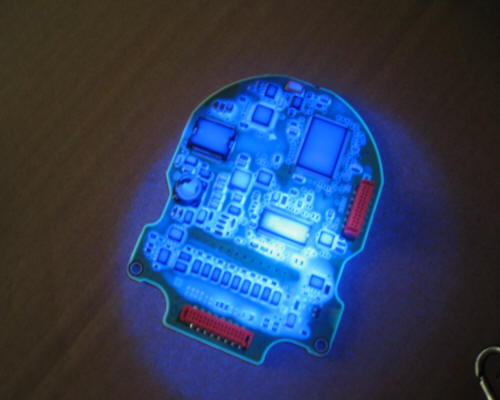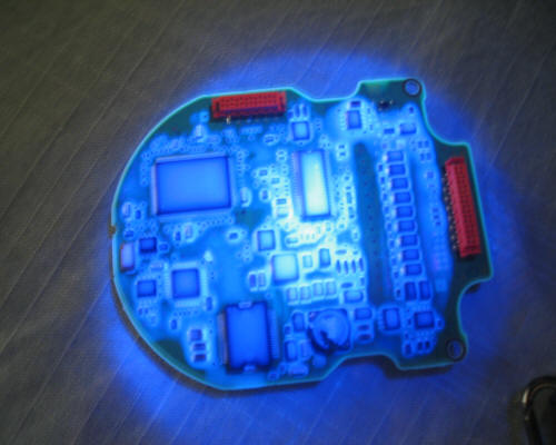 下圖為防水膠涂覆過(guò)的電路板在黑光燈紫外線光照射下看到的效果: