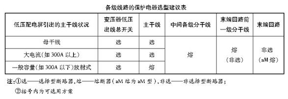 各級(jí)線路保護(hù)電器選型列于見(jiàn)下表。