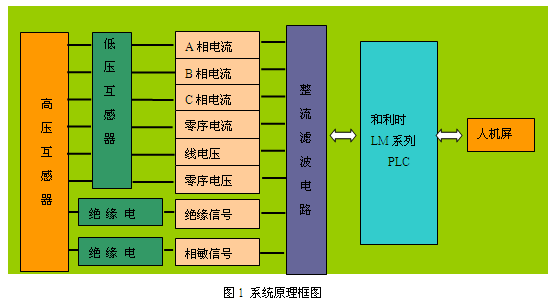 系統(tǒng)原理框圖如圖1。該配電開關(guān)的線路保護(hù)功能需在高壓互感器上采集三相電流、零序電流、一個(gè)線電壓、零序電壓、絕緣以及相敏共八路信號(hào)。這八路信號(hào)通過低壓互感器,然后經(jīng)過整流和濾波變成直流的標(biāo)準(zhǔn)信號(hào),最后進(jìn)入PLC 以控制斷路器的分閘輸出。