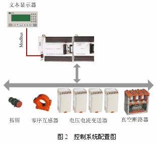 PLC使用和利時(shí)公司LM系列可編程控制器,LM系列PLC是和利時(shí)公司生產(chǎn)的小型一體化PLC。本應(yīng)用中CPU模塊選擇本體上集成14 點(diǎn)輸入/10點(diǎn)繼電器輸出的LM3107模塊,模擬量輸入選擇和利時(shí)公司特有的電量采集模塊LM3315模塊,它為12 位精度,完成電壓和電流采集的同時(shí),完成功率計(jì)算。本模塊能夠滿足井下比較惡劣環(huán)境,能夠滿足中性點(diǎn)不接地的供配電系統(tǒng)供電保護(hù)要求。系統(tǒng)中顯示部件選用了和利時(shí)公司四行藍(lán)色文本屏,通過串口以Modbus RTU協(xié)議與PLC通訊,實(shí)時(shí)顯示采集值??刂葡到y(tǒng)配置圖見圖2。