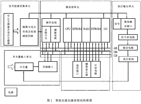智能化斷路器中智能化技術(shù)的應(yīng)用核心是集保護(hù)、測(cè)量、監(jiān)控于一體的多功能脫扣器, 它主要由微處理器單元、信號(hào)檢測(cè)采集單元、開關(guān)量輸入單元、顯示和鍵盤單元、執(zhí)行輸出單元、通信接口、電源等幾個(gè)部分組成。如圖1 所示。