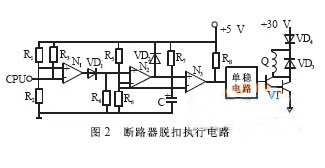 智能化斷路器的執(zhí)行元件為一個(gè)帶永久磁鐵的磁通變換器, 其特點(diǎn)是體積小, 功耗低, 脫扣力大。正常工作時(shí)永久磁鐵使動(dòng)靜鐵芯保持吸合。來自互感器的過載、短路、接地等故障信號(hào), 按預(yù)先設(shè)計(jì)好的保護(hù)特性要求, 經(jīng)微處理器單元處理后, 發(fā)出一定寬度的跳閘脈沖(負(fù)方波脈沖)送到磁通變換器的線圈,產(chǎn)生反向磁場(chǎng), 抵消永久磁通, 動(dòng)鐵芯釋放產(chǎn)生的機(jī)械能量推動(dòng)斷路器的脫扣器使斷路器分?jǐn)? 其脫扣執(zhí)行電路如圖2 所示